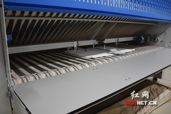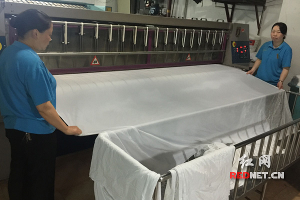 清洗完的床单经过平烫机,就像变魔术一般变得干爽平整。图为金源阳光酒店