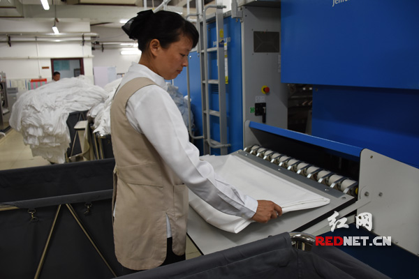 芙蓉南路现代凯莱大酒店负一楼的洗衣房宽敞明亮,清洗女工们都在各司其责忙碌地工作。洗衣房经理易慧说:“虽然洗衣房造价高,可是机器的智能化在很大程度上能给酒店节省很多人力物力。你看我们这台平烫机,清洗好的床单过机就能完全干燥,再经过自动折叠机,就可以直接送到布草房储存,完全不用烘干和人工折叠的工序。”